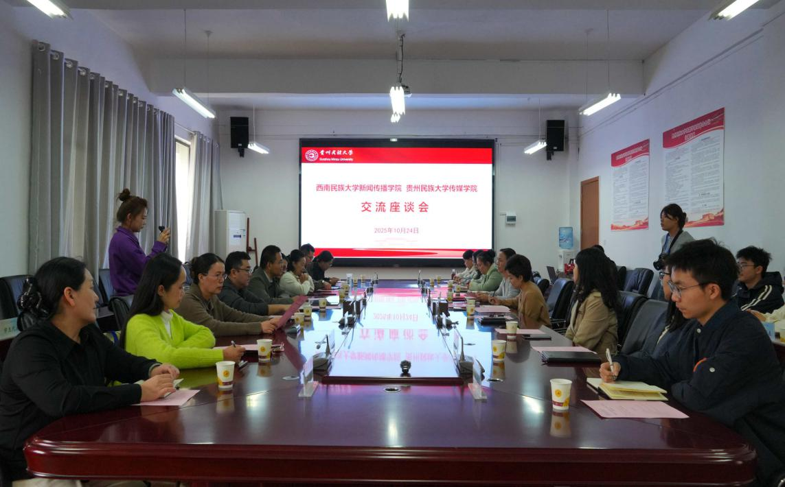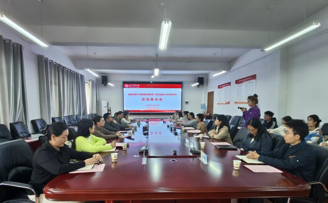 川黔两院聚首,共谋发展蓝图。10月24日,西南民族大学新闻传播学院党委副书记、院长胡言会带领学院领导及相关负责人赴贵州民族大学传媒学院访问交流,在贵州民族大学传媒学院会议室召开交流座谈会。会议旨在就两院有关工作开展调研,深化战略合作,共谋民族高等传媒教育高质量发展。贵州民族大学传媒学院党委书记吕映红在会议上致欢迎辞,两院各有关部门负责人出席会议,会议由贵州民族大学传媒学院副院长伍顺比主持。