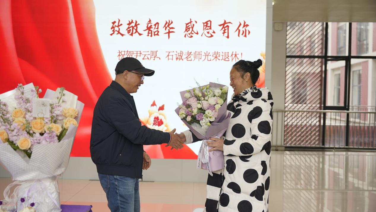 最后,石诚老师做荣退发言。她希望各位老师能把握当下、为社会多做贡献,并表示自己退休后也会坚持学习,同时对学校发展献出美好祝愿。“退休后我会享受生活、学习新知识、保持健康心态。祝愿学校蒸蒸日上,同事们身体健康!”