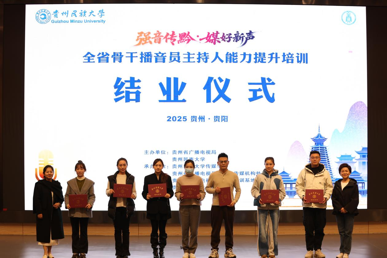 2025年11月30日,为期三天的“强音传黔・媒好新声”全省骨干播音员主持人能力提升培训在贵州民族大学顺利完成并举行结业仪式。本次培训由贵州省广播电视局主办、贵州民族大学传媒学院联合承办,全省各地骨干播音员主持人参训。