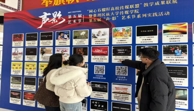 “本届艺术节采用线上线下双轨并行模式,为观众提供全方位观展体验。”负责布展的李娟老师介绍。线上展映矩阵联动贵州广播电视台动静APP等省级主流媒体平台,开设联盟专属展映专栏,构建集作品展示、互动评论、影响力分析于一体的数字化展陈空间;线下则精心打造“声影长廊”成果展区,在传媒学院教学楼一楼大厅通过系列化、主题化展架设计,形成视觉震撼、叙事连贯的观展动线。